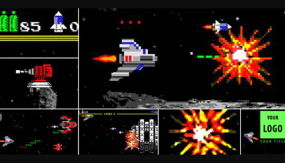 Space style arcade game introduction logo reveal. Arcade explosions and shots sounds included.
