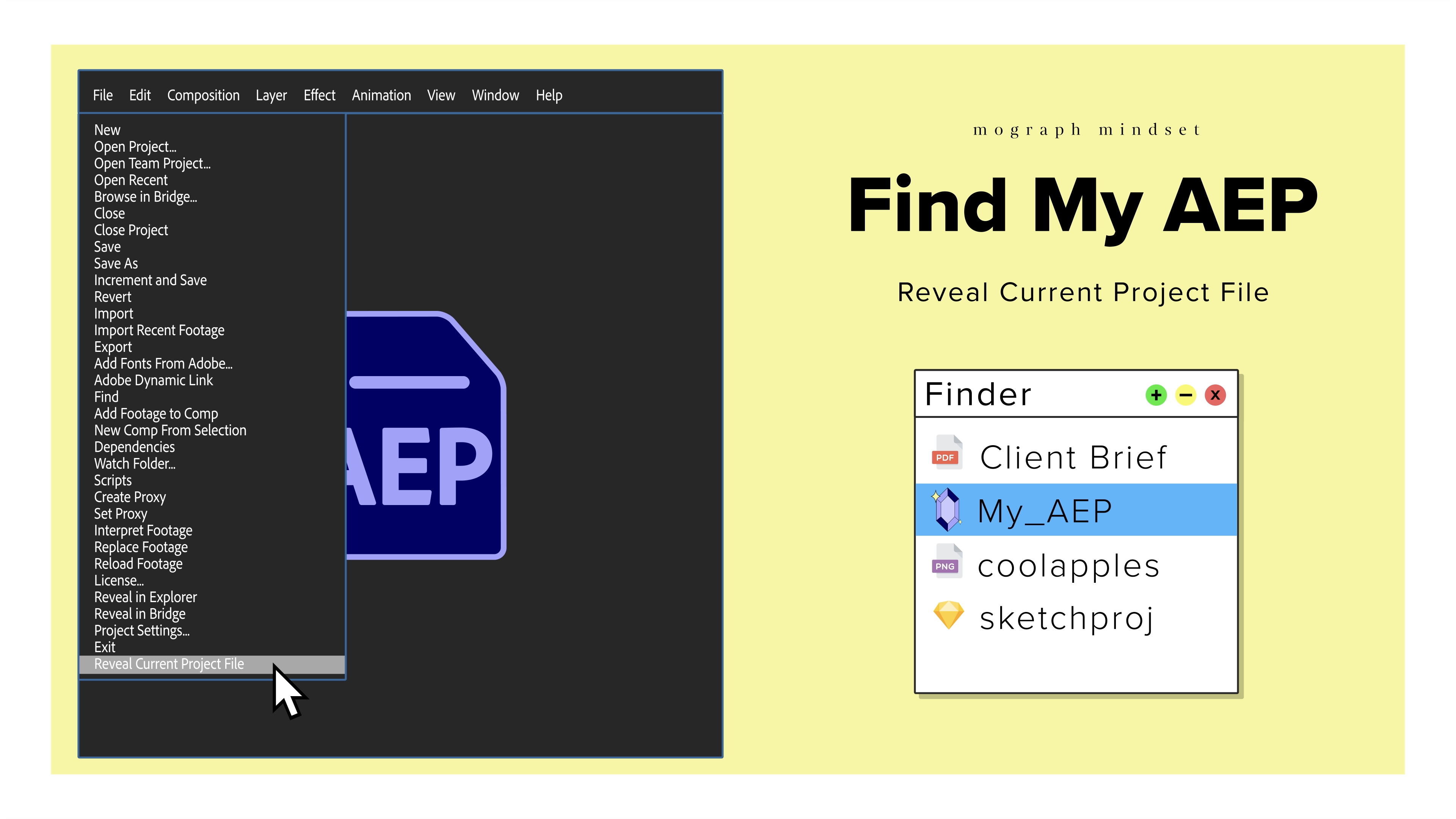 Find My AEP reveals where the current After Effects project resides in the filesystem.