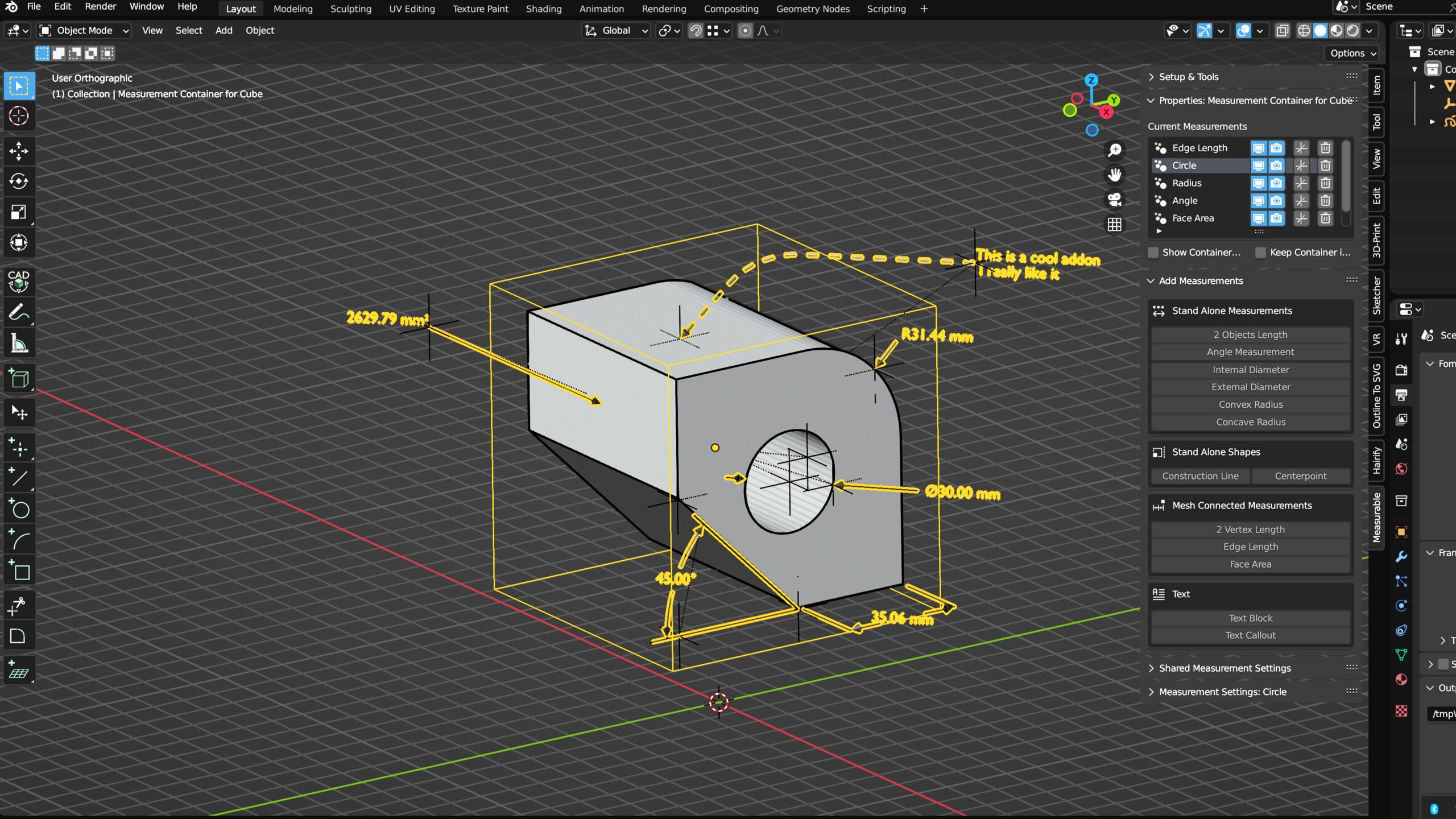 In a nutshell Measurable is a Blender addon that makes it easy to create technical-style drawings in Blender. Providing a comprehensive set of tools to create technical-style drawings in Blender, with a wide range of measurement types and easy-to-use settings to customize measurements to suit your needs.