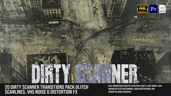 20-Dirty Scanner Transitions Pack – Glitch Scanlines, VHS Noise & Distortion FX For MOGRT Demo and Download