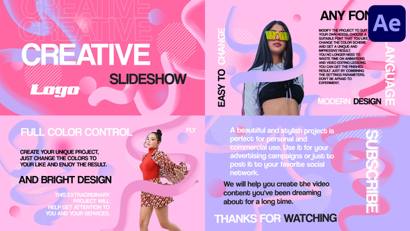 Abstract Creative Slideshow for After Effects 44935056. Abstract Creative Slideshow is a modern smooth style project that will impress your audience and develop the look of your work in a few clicks. Add your media, edit text and customize colors to your liking. A great way to show off your photos from events, invitations, family albums, presentations, commercials, promotions and more.
