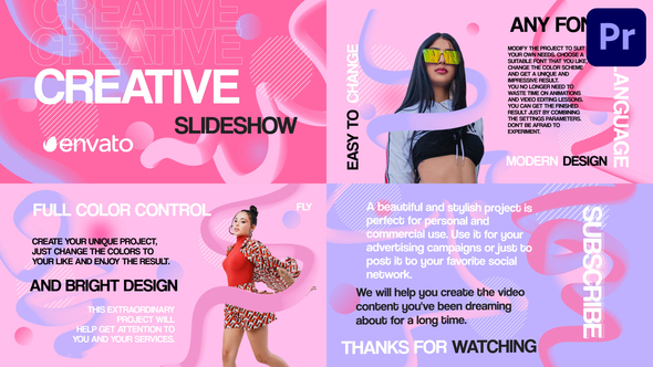 Abstract Creative Slideshow for Premiere Pro 43127244 Abstract Creative Slideshow is a modern smooth style project that will impress your audience and develop the look of your work in a few clicks. Add your media, edit text and customize colors to your liking. A great way to show off your photos from events, invitations, family albums, presentations, commercials, promotions and more.