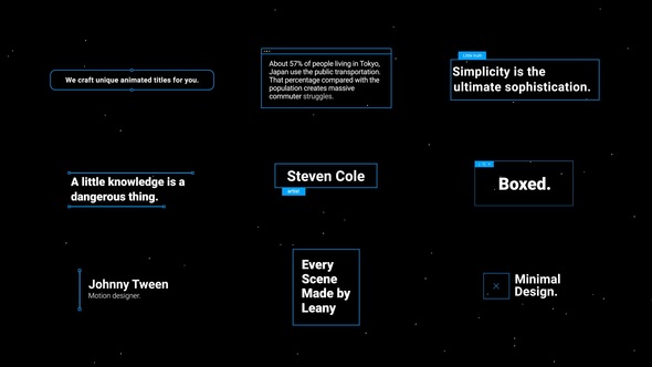 Boxed Titles is a uniquely designed and animated lower thirds and titles kit. Featuring minimalistic looks, the can work amazingly with your next corporate video, interview sequences, or documentary work. Using them is so easy, just replace the type and add to your videos. Your audience will love the professional look that these animated graphics will give any video.