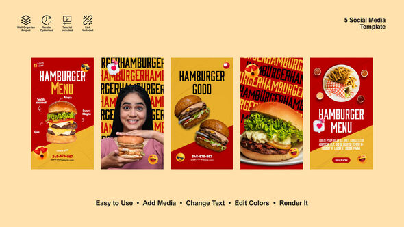 Free Download Burger Instagram Stories. Are you seeking the secret ingredient to spice up your social media presence and showcase your mouthwatering burger menu? Burger Instagram Stories offers a delectable solution to captivate your audience’s appetite. With vibrant and savory templates, it’s effortless to highlight your latest offerings, share exclusive deals, and reel in the foodies. Elevating your food marketing is as simple as savoring a juicy patty with this easy-to-use After Effects template. Craft a visual feast for the eyes with 12 media and 17 text placeholders, all in stunning Full HD. You don’t need any plugins, and with a helpful tutorial video, you’ll be sharing your burger highlights in no time. Whether you’re snapping photos or filming videos, these five unique designs from studiomangoo on VideoHive guarantee an engaging story for every taste bud.