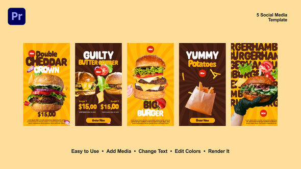 Burger Instagram Stories template for Premiere Pro allows quick customization with five unique story designs for engaging burger promotions in Full HD.