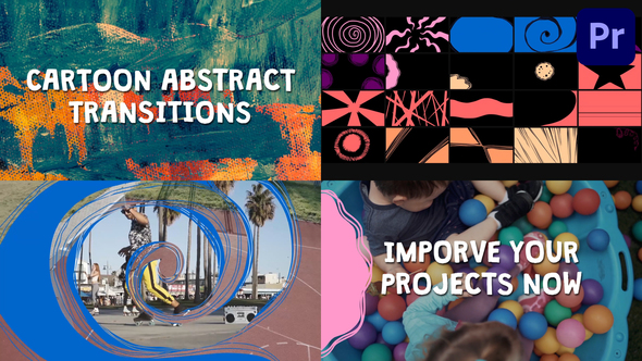 Cartoon Abstract Transitions for Premiere Pro 43084211 Cartoon Abstract Transitions is a fresh and colorful animation template that contains a collection of transitions in a comic style. Use these effects to improve the look of your work and impress your audience. Best for family slideshows, social media openers, and more.