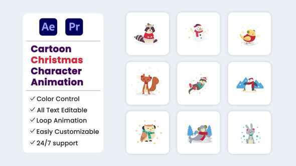 Free Download Cartoon Christmas Character. Bring your holiday projects to life with the Cartoon Christmas Character template for After Effects and Adobe Premiere Pro. Perfect for explainer videos, social media posts, and more, this tool features 10 ready-to-use Christmas characters and supports multiple languages. The templates are 100% resizable, require no plugins, and include a helpful video tutorial. Create stunning, festive animations with ease and make your content stand out this holiday season!