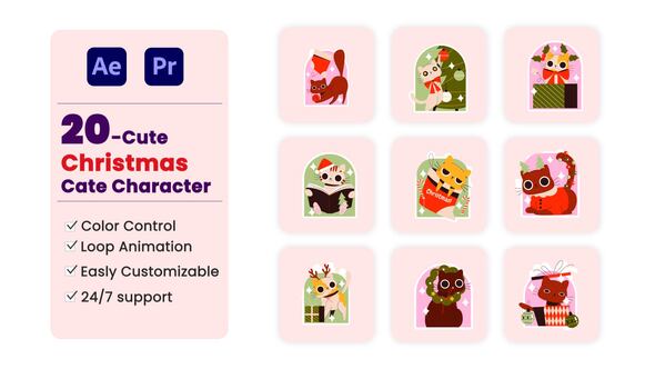 The Christmas Cat Illustration Character Pack for After Effects and Premiere Pro CC 2021 features 20 customizable, vector-based characters, ideal for festive projects and marketing materials.