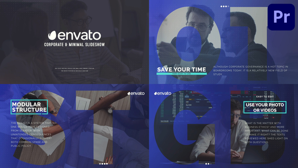 Corporate & Minimal Slideshow for Premiere Pro 43287293 Corporate & Minimal Slideshow is a business style project that will surprise your audience and improve the look of your work. Add media and logos, type your text and customize colors in a few clicks. A great way to develop your presentation, portfolio, advertisements, commercials, promotions and more.