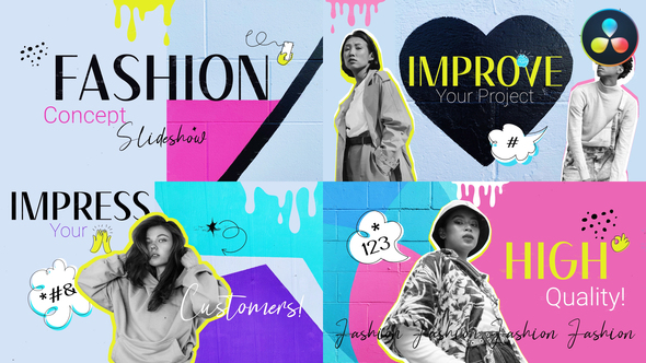 Fashion Concept Slideshow for DaVinci Resolve 43384842 Fashion Concept Slideshow is a colorful, bright, and stylish slideshow template in motley street art style. Fully customizable colors. Extremely easy to use, carefully grouped, named, and organized. Just add these scenes to improve your fashion presentations, portfolio, stylish social media content and more. Add images, combine slides, type text with any font, customize colors and enjoy the result.