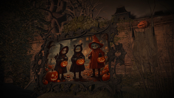 • Utilizes a camera that travels around a spooky abandoned cemetery scene, effectively setting a Halloween mood.