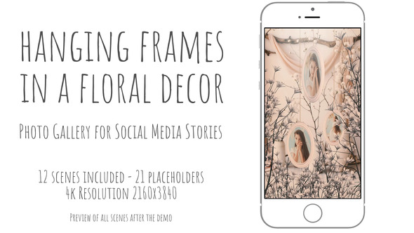 Experience the beauty of hanging frames in floral decor with this user-friendly 3D scene collection for social media. Add photos to 12 stunning scenes and create breathtaking slideshows effortlessly. Render your project in 4K Ultra HD vertical format, making it ideal for Instagram, TikTok, and Facebook. With 21 media placeholders and no plugins required, customization becomes simple and quick. Elevate your content with ease using this powerful tool, perfect for creating memorable visual presentations.