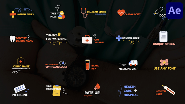 Hospital Titles for After Effects 46021569. Hospital Names is a useful titles template consisting of creative medical animations with texts. Very easy to use! Just edit the text, change the color in a few clicks! It’s a great way to decorate your videos about health, medical ads and more.
