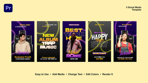 Equipped for Premiere Pro 2023 or newer, Instagram Party Stories provides you with five unique full HD vertical templates, all with a sleek 1080×1920 resolution and a smooth 25 fps frame rate. It’s designed to be user-friendly, ensuring that even novices can create eye-catching content with ease.