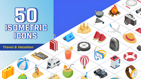 • 50 Isometric Icons: Offers a diverse range of travel and vacation-themed visuals for creative projects.