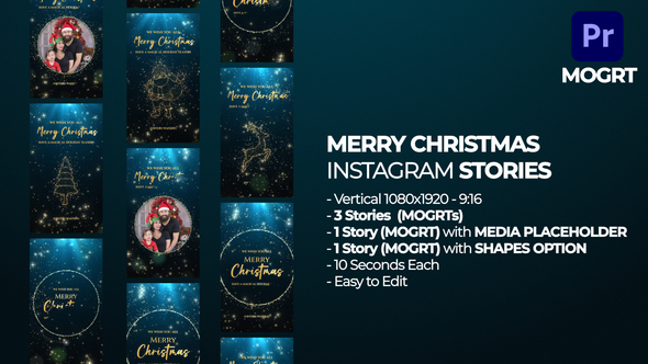 Free Download Merry Christmas Instagram Stories MOGRT. If you’re looking to spice up your Instagram and TikTok content this festive season, the Merry Christmas Instagram Stories MOGRT for Adobe Premiere Pro CC2021 is your go-to solution. This MOGRT (Motion Graphics Template) set is perfect for creating eye-catching Christmas stories and reels. It offers three different vertical story projects, including options for multiple shapes and media placeholders, making it highly versatile for all your social media needs. Simple to use and no need for After Effects, you can easily personalize your posts within Premiere Pro. Make your holiday posts stand out with minimal effort!