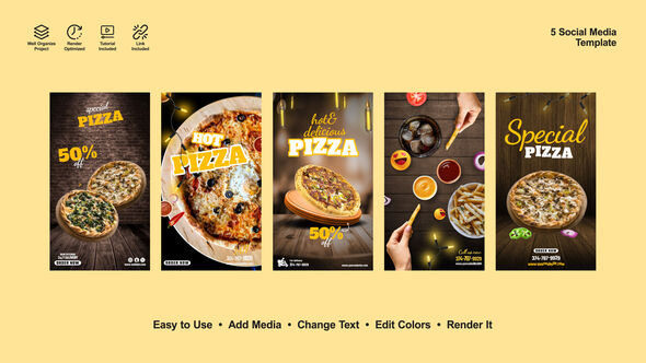 • ‘Pizza Instagram Reels’ includes a set of five unique Instagram Stories/Reels templates. This variety allows for a dynamic range of presentations, ensuring that your content remains fresh and interesting with each new post.