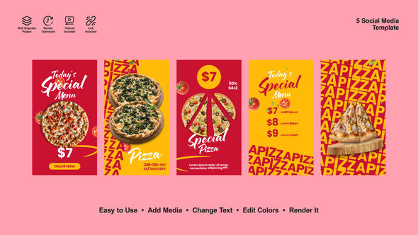 The package includes five distinct Instagram Story or Reel designs, each boasting a crisp 1080×1920 Full HD vertical resolution. These templates operate at a smooth 25 fps frame rate and support both photo and video content, enhancing the flexibility of your promotions. Critical to user ease is the inclusion of a tutorial video and font link, streamlining the creation process. With 10 media and 24 text placeholders, ‘Pizza Instagram Stories’ is an indispensable tool for businesses and influencers looking to promote their gastronomic offerings effectively on Instagram. With this template from VideoHive, you can craft enticing visuals that are not only appealing but will also help you stand out in the bustling world of Instagram content.