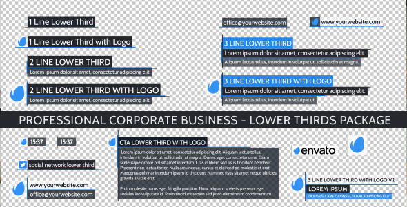 The package boasts 17 distinct lower thirds styles, ranging from minimalist single lines to comprehensive triple line options, with or without logo placements. There are specialized designs for calls to action, social network identification, and contact information, ensuring versatility for various business needs. Remarkably, these lower thirds need no additional plugins, streamlining the post-production process.