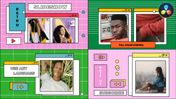 Retro Pop Ups Slideshow for DaVinci Resolve 43014819 Retro Pop Ups Slideshow is a creative template in the style of vintage pop ups. Full color control smart controllers. Just use this template to create an old fashioned presentation, video game channel intro, and more. Add your multimedia, type any text, customize colors and enjoy the result.