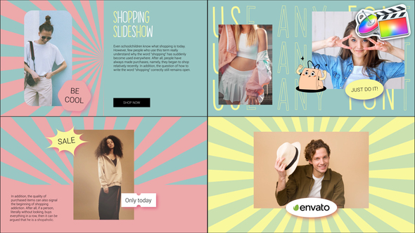 Retro Shopping Slideshow for FCPX 43105840 Retro Shopping Slideshow is a stylish neat and vibrant template with dynamic and smoothly animated scenes for your media and texts. Very easy to use! Just edit the text placeholder, import media files, change the color and enjoy. A great way to showcase your fashion portfolio, sales, promotional offers for your product, and more. Impress your audience with this cool animated template.