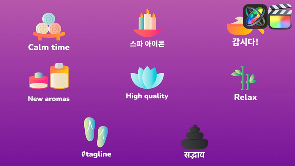 The ‘Spa Massage Icons and Titles for FCPX’ offers customizable, animated icons and text ideal for promoting wellness and relaxation services in your videos.