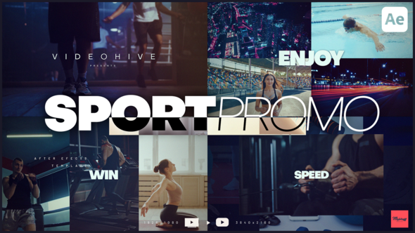 “Sport Promo” offers Full HD and Ultra HD resolutions with smooth 29.97 fps at 36 seconds, no plugins required. Fonts are free; images from Pexels.