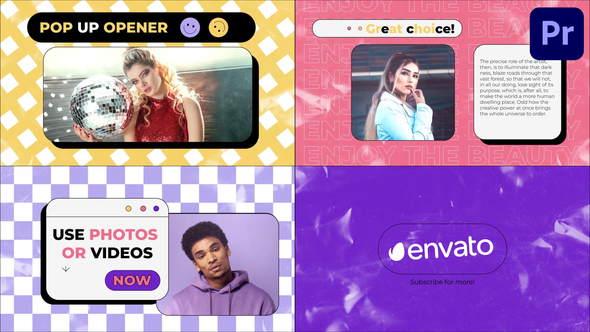 Stylish Pop Up Opener | Premiere Pro MOGRT 43236739 Stylish Pop Up Opener – is a positive colorful slideshow template, that will help you create a bright presentation, stylish promotions, trendy intros and much more! Add media, logo, customize colors and text, merge slides with just a few clicks!