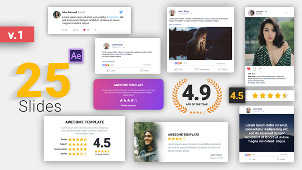 Testimonial And Review Tool 24215925. After Effect templates with 25 testimonials, social media posts, and review elements.