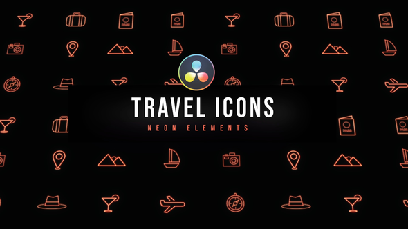 Elevate your travel-themed video projects with the dynamic ‘Travel Neon Icons’ for DaVinci Resolve. With 10 vibrant icons at a resolution of 1920×1080 FULL HD, this template is perfect for creators aiming for a contemporary look. The icons are ready to use in DaVinci Resolve 18 or newer versions, designed for simple drag-and-drop functionality, featuring customizable color controllers for a personalized touch. Note: the package does not include the images/videos and background music, which you can download from here: [Electro Dark Cyberpunk Music](https://audiojungle.net/item/electro-dark-cyberpunk/38769242).